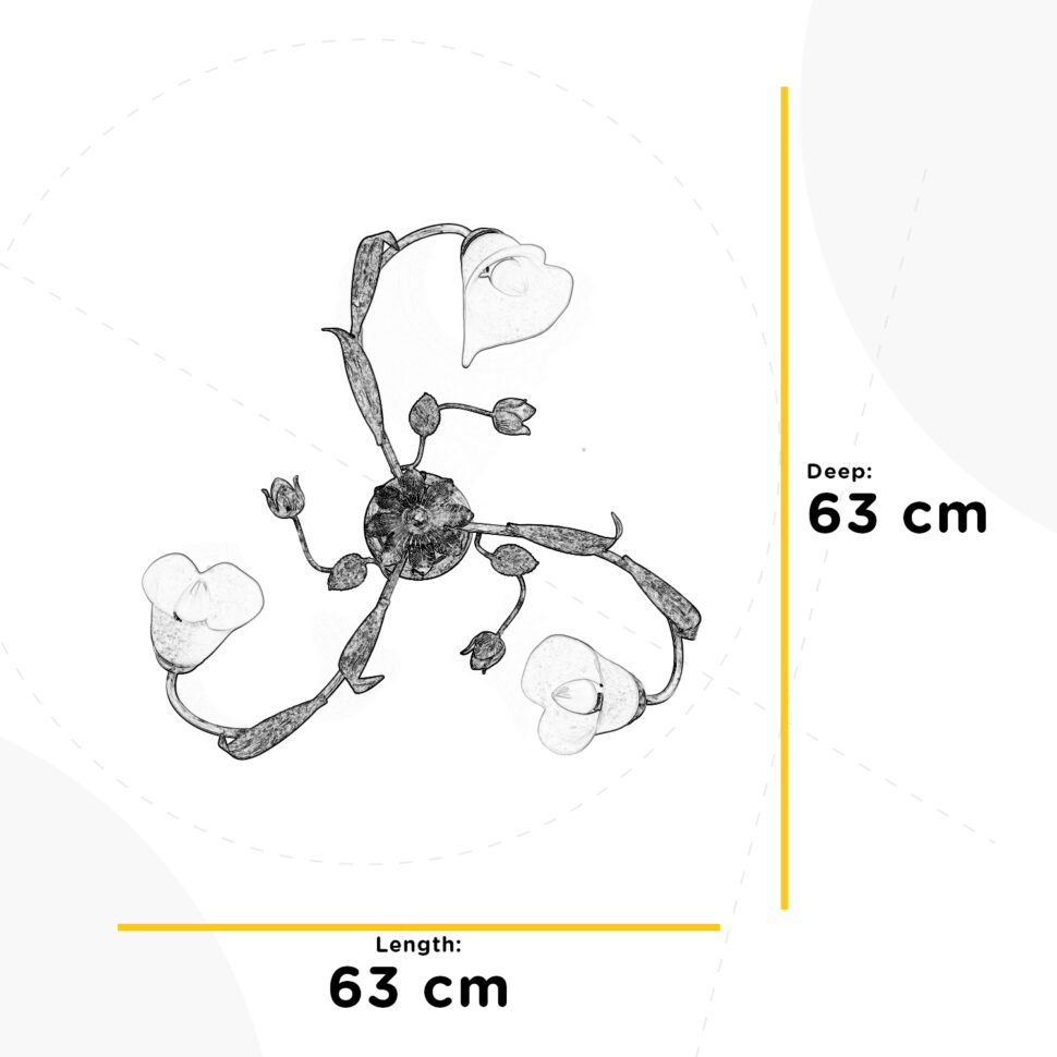 Lampada da soffitto a 3 luci con attacco E14. I decori floreali lo rendono elegante e affascinante. Perfetta per il bagno, ideale per la zona notte e la zona giorno. La plafoniera ha diametro 63 cm ed è alta 21 cm.
