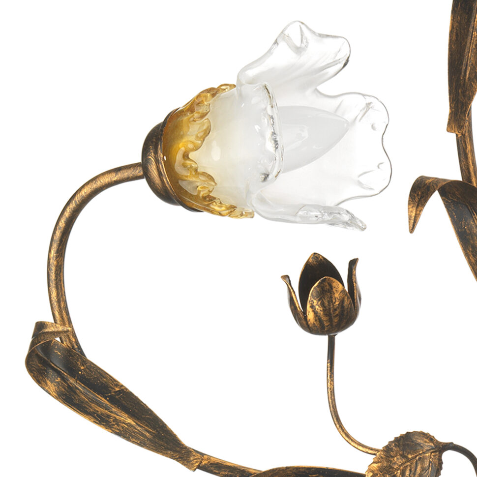 Ogni lampada della collezione Arianna racchiude in sé il fascino dello stile classico, racconta storie di altri tempi e si sposa bene con gli ambienti rustici. Le linee di questa collezione sono armoniose, hanno molteplici richiami floreali, tanto nella struttura quanto nei paralumi. La loro forma è infatti quella di un fiore, al cui interno si inserisce la lampadina che ne esalta i particolari. I paralumi sono realizzati in vetro soffiato e poi tirato a mano; il loro colore è il bianco, arricchito da una colatura ambrata. L’effetto luminoso che creano dona all'ambiente un tono caldo, intimo. Contribuiscono al calore dell'atmosfera anche le linee della struttura in ferro lavorato a mano, in quanto ricche di preziose decorazioni, quali foglie e boccioli dello stesso colore, vale a dire bronzo spennellato oro.
