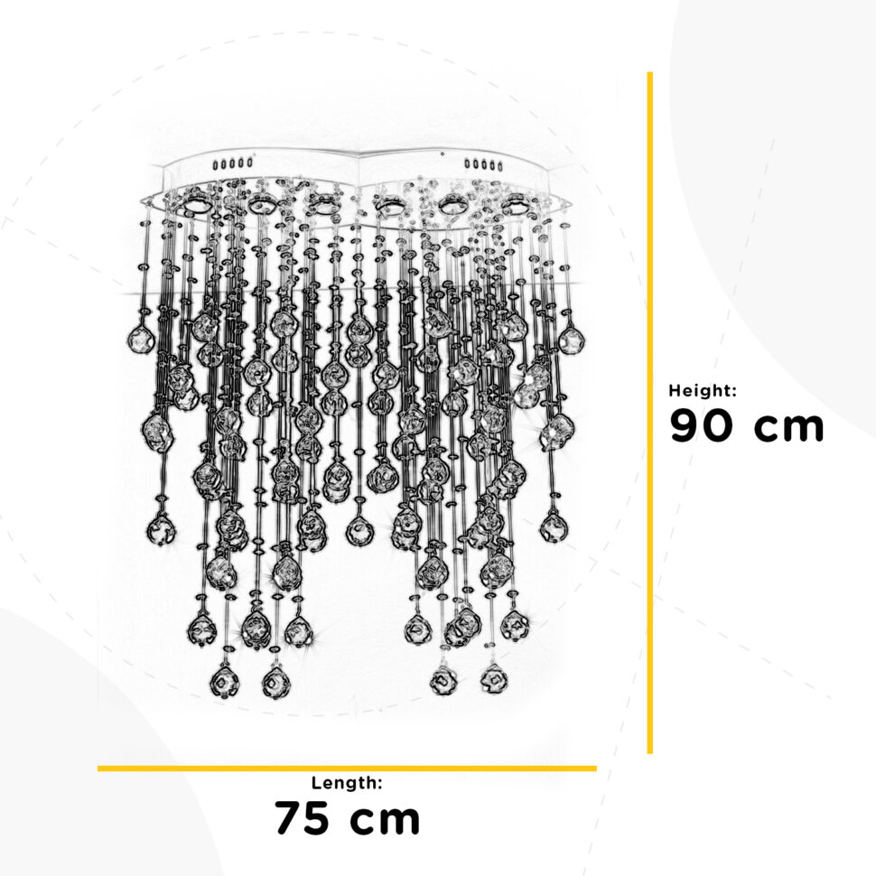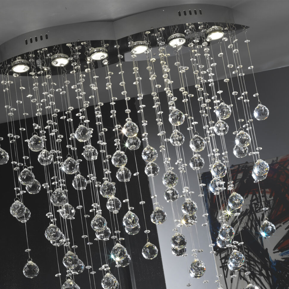 Ciò che colpisce della lampada è, ovviamente, la sua cascata di cristalli, che sono di due tipologie differenti. I singoli fili alternano cristalli tondi ad altri sferici. Sono entrambi sfaccettati e di tipo K9, cosa che crea dei riflessi di luce notevoli. Il gioco di luci che generano ad ogni ora del giorno è favoloso, perfetto per ambienti importanti, come la hall di un albergo per esempio, ma anche un salotto o una camera da letto.
