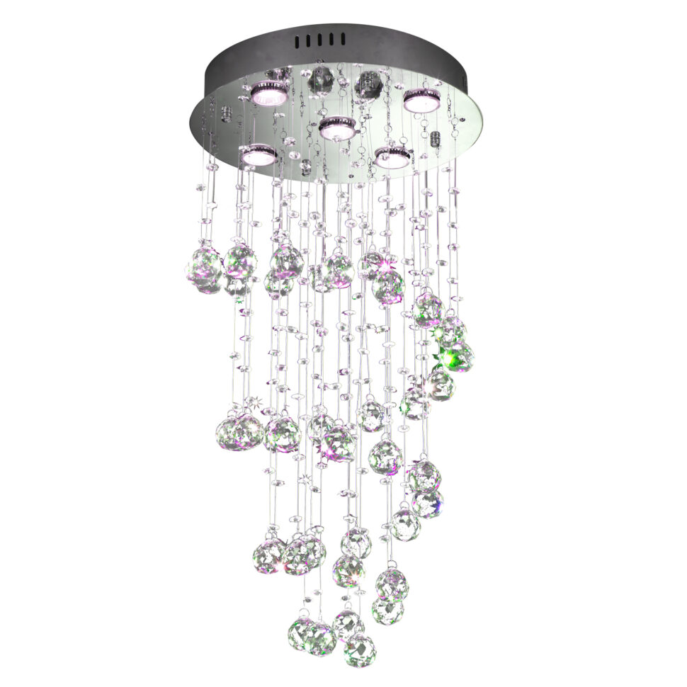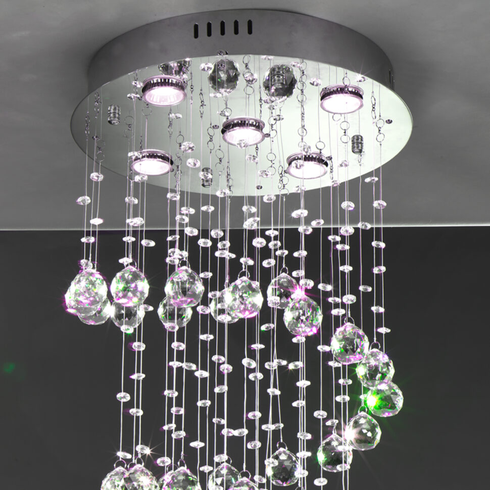 La struttura di questa lampada da soffitto è in metallo cromato lucido ed è qui che vanno inserite le lampadine, che devono essere 5 GU10. Lo specifichiamo in quanto spetta a te acquistarle. Puoi farlo anche dal nostro shop, ma devi, appunto, aggiungerle a parte in quanto non sono incluse.
