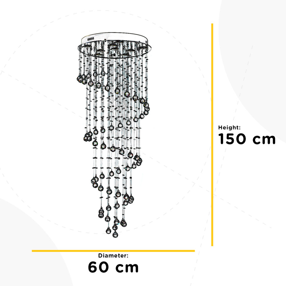 L'elemento che colpisce della lampada è la spirale di cristalli che ha un movimento armonioso quanto ipnotico, essa è sospesa e scende dolcemente dall'alto verso il basso. A tenerla ci sono dei fili trasparenti, i quali sono anch'essi arricchiti da cristalli, dalle dimensioni più piccole.