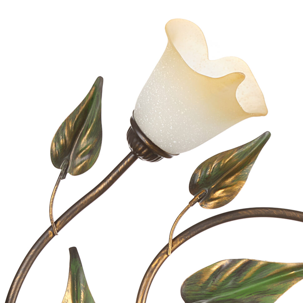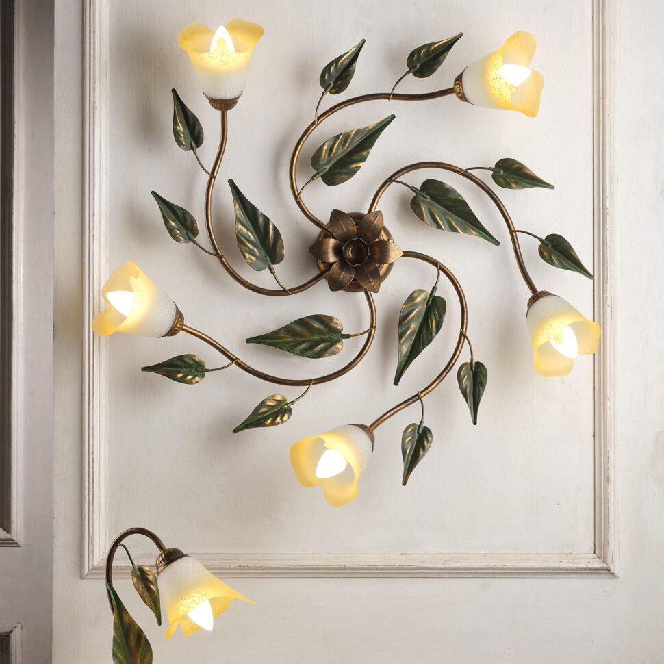 La collezione è una delle più grandi del nostro catalogo e ve ne siamo particolarmente affezionati. I modelli di lampade differiscono sì per la tipologia, ma anche per i movimenti delle strutture, che sono tutte in ferro lavorato a mano color bronzo, sul quale sono state aggiunte delle spennellate color oro. Le decorazioni sono foglie e fiori, le foglie sono verdi spennellate oro e di dimensioni differenti. Quasi tutti uguali, fatta eccezione per un solo modello, sono i paralumi, la cui forma ricorda uno dei fiori più belli e sensuali, la calla. I paralumi sono in vetro bianco sfumato color ambra con interno sabbiato.