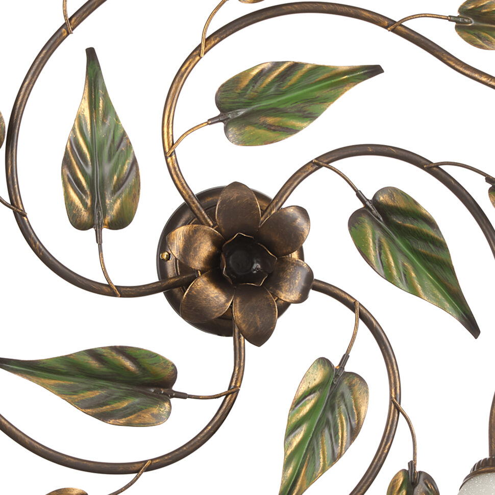 Lampada da soffito a 5 luci con paralumi a forma di calle bianche sfumate ambra con interno sabbiato. Struttura in bronzo spennellata oro lavorata a mano in Italia. Ad arricchire le forme essenziali, vi sono le foglie verdi. Ideale per qualsiasi zona della vostra casa, specialmente quella giorno. Attacchi E14, lunghezza 20 cm, diametro 70 cm. La musa ispiratrice della collezione Miranda è la natura. Le decorazioni sono foglie e fiori, le foglie sono verdi spennellate oro e di dimensioni differenti. I paralumi ricordano uno dei fiori più belli e sensuali, la calla. I paralumi sono in vetro bianco sfumato color ambra con interno sabbiato. Le lampade Miranda si sposano bene negli ambienti classici e rustici, dove cioè si privilegiano arredi che parlano di antiche usanze e tradizioni, dove il tempo sembra essersi fermato e sospeso.