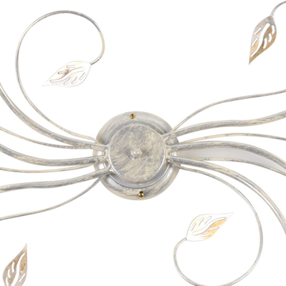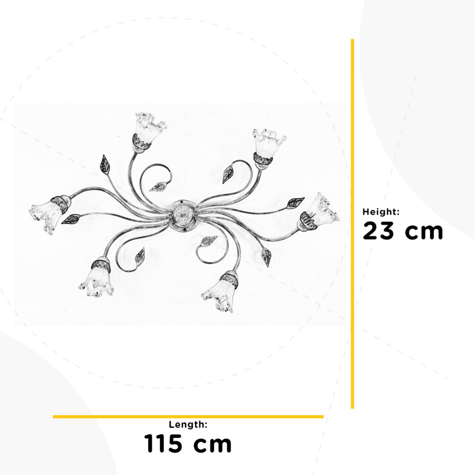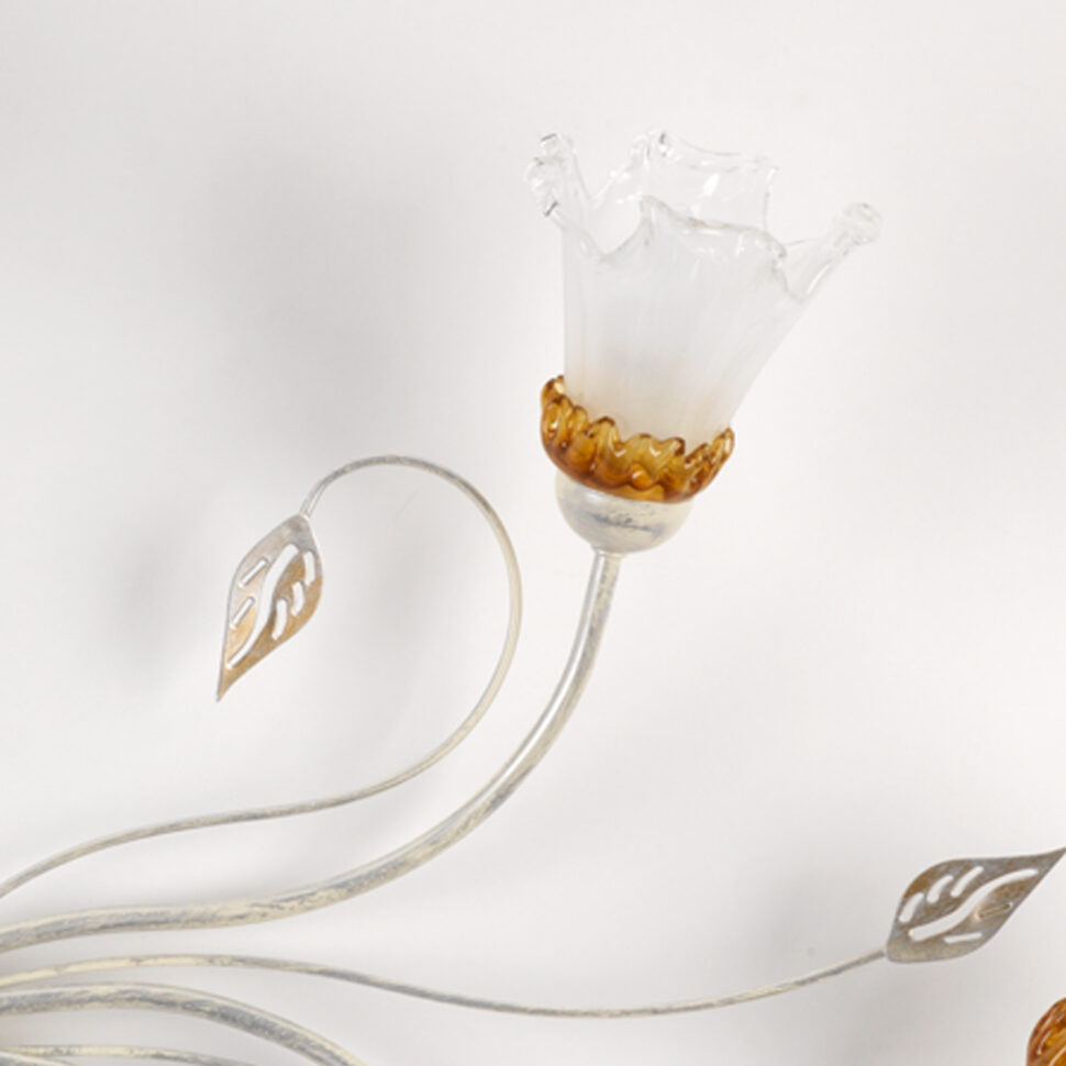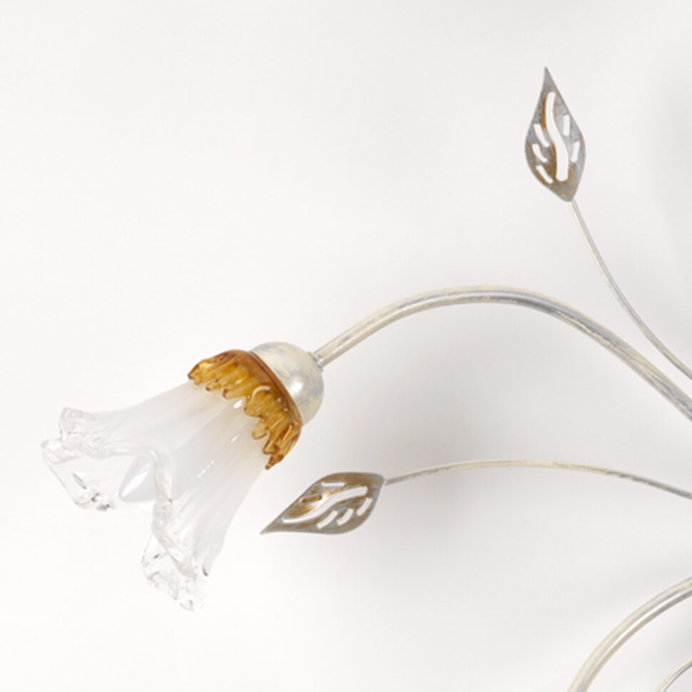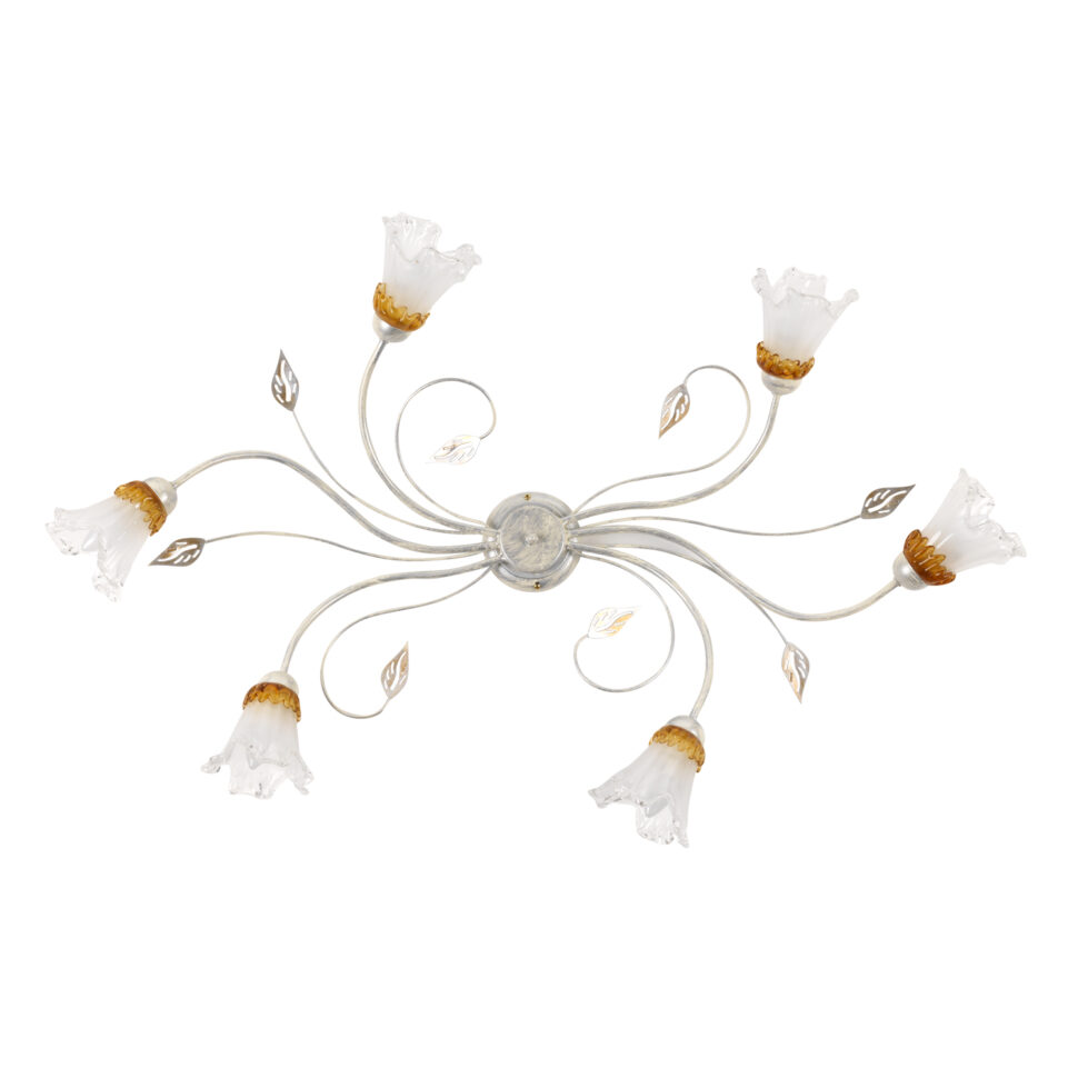 Lampada da soffitto a 6 luci. Struttura bianca spennellata argento e oro, a riprendere l'ambra delle calle in vetro. Perfetta per il bagno, la camera da letto, la sala e il salotto.