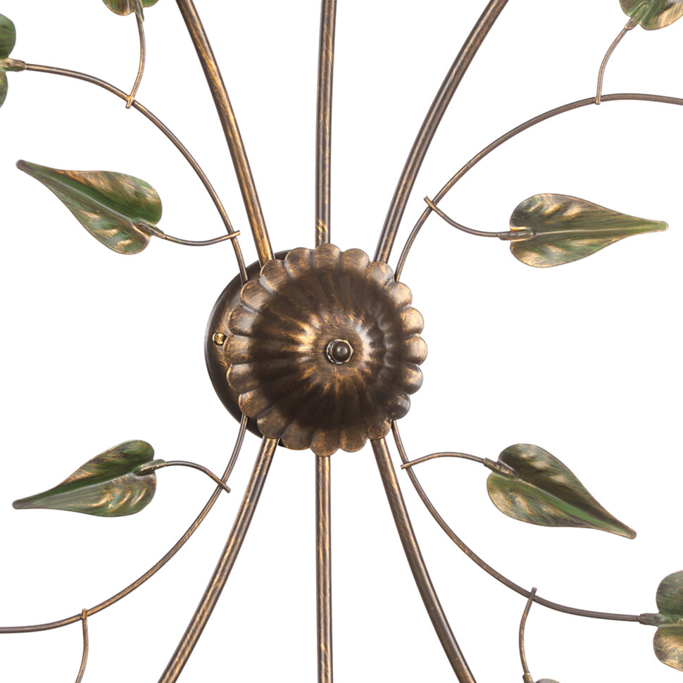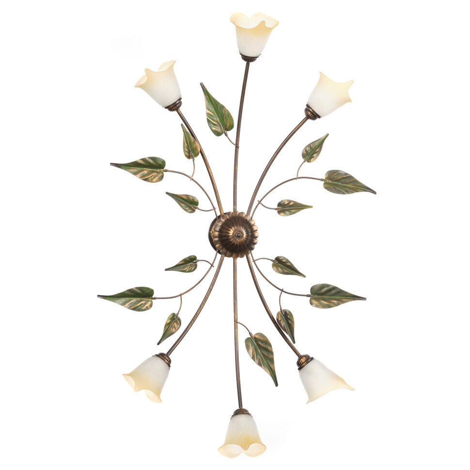 La collezione è una delle più grandi del nostro catalogo e ve ne siamo particolarmente affezionati. I modelli di lampade differiscono sì per la tipologia, ma anche per i movimenti delle strutture, che sono tutte in ferro lavorato a mano color bronzo, sul quale sono state aggiunte delle spennellate color oro. Le decorazioni sono foglie e fiori, le foglie sono verdi spennellate oro e di dimensioni differenti. Quasi tutti uguali, fatta eccezione per un solo modello, sono i paralumi, la cui forma ricorda uno dei fiori più belli e sensuali, la calla. I paralumi sono in vetro bianco sfumato color ambra con interno sabbiato.