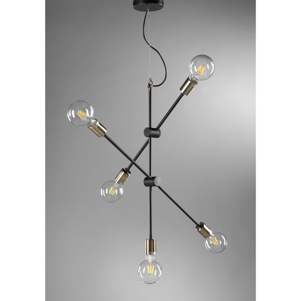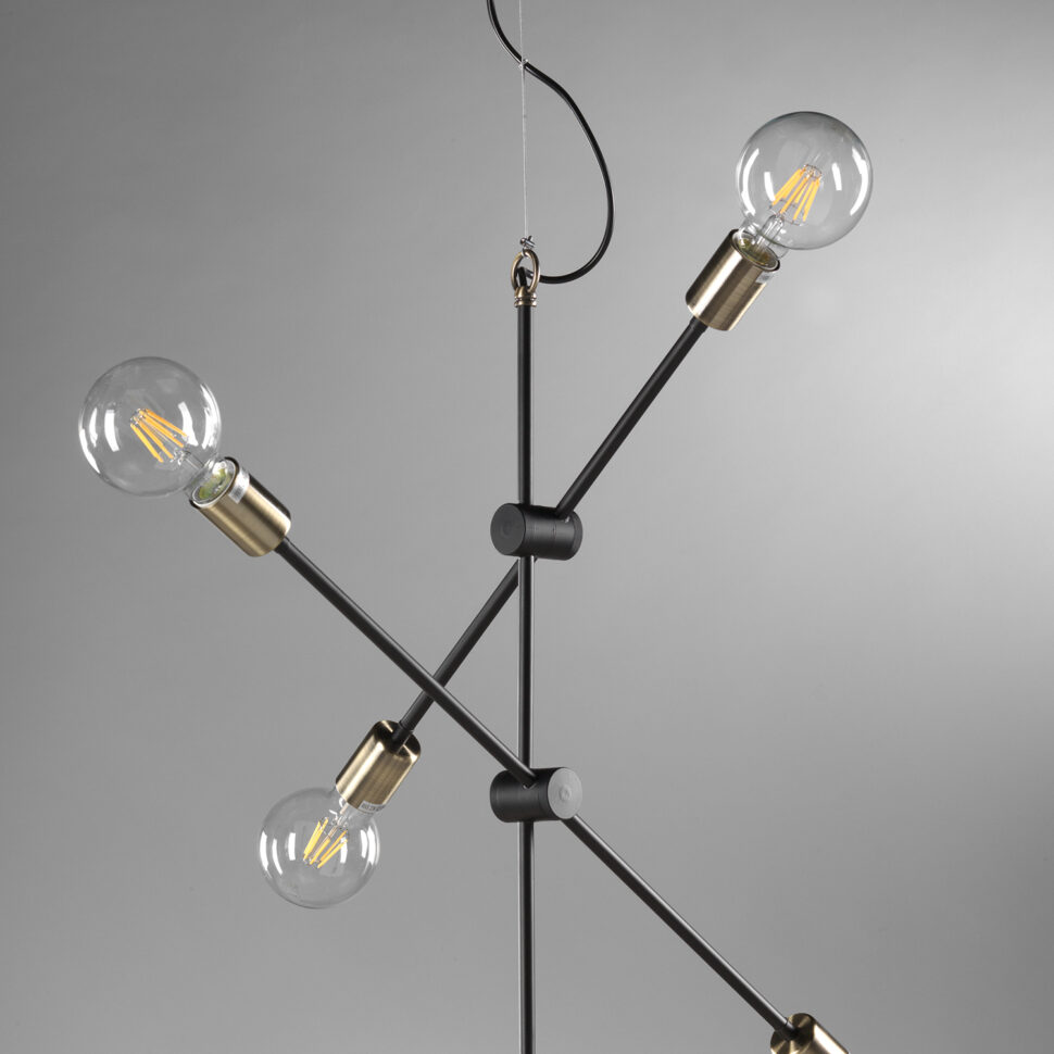 Lo stile è urban, moderno ed essenziale nei tratti. Oltre alla struttura in metallo nero presenta delle placche ambrate vicino agli attacchi per le lampadine, che sono il fulcro di questo modello di lampada. L'attenzione ricade proprio su di esse. Per questo per un’ottima visione d'insieme, per ricreare cioè a casa propria l’effetto che si vede qui in foto, è importante scegliere correttamente le lampadine. L’attacco presente è un E27, noi consigliamo di optare per le led globo con filamenti.