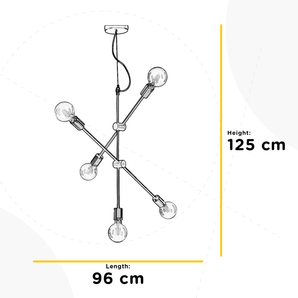 Questa lampada da soffitto si compone di tre aste, una centrale e due perpendicolari, che presentano ciascuna un punto luce all'estremità. In totale conta quindi 5 punti luce e 4 di questi sono leggermente direzionabili. Le aste orizzontali infatti possono essere inclinate un po' e dare sembianze sempre diverse alla lampada stessa.