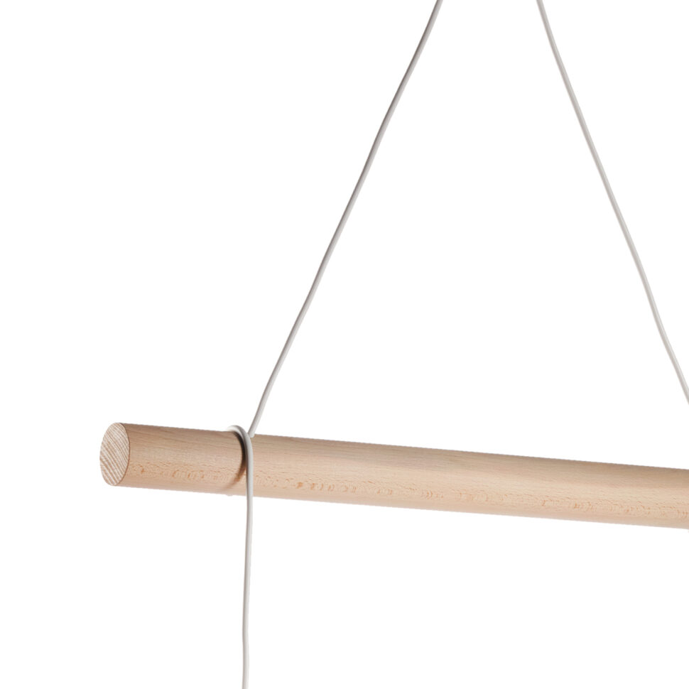 L'altro fattore che contraddistingue la collezione Baldo è l’asta a cui si appendono i paralumi. Tale barra dona un aspetto un po’ naturale alle lampade, nonostante non sia veramente in legno come potrebbe sembrare. Si tratta di un tubo metallico in cui è stato dato un effetto legno. La sua presenza è molto importante in quanto contribuisce alla creazione di atmosfere autenticamente confortevoli.