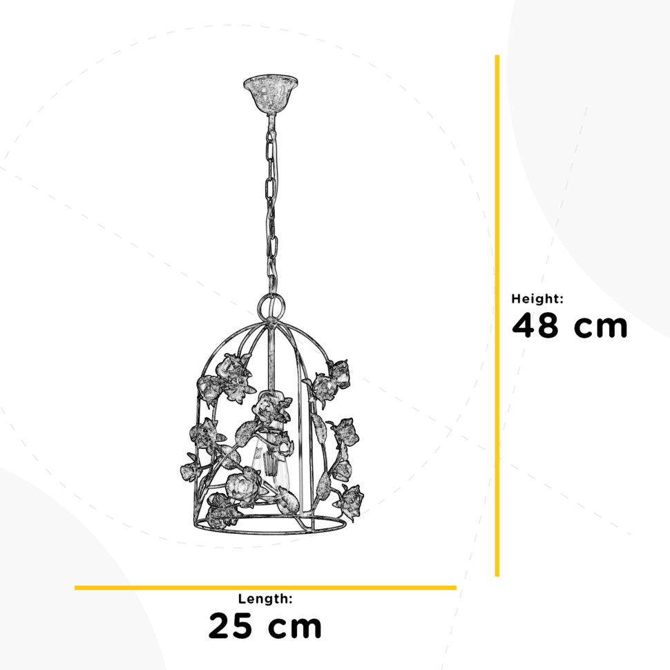 Lampada a sospensione a una luce. La lampadina (non inclusa) è racchiusa nella struttura metallica decorata da eleganti roselline. Perfetta per la sala da pranzo, si adatta anche a camere da letto e cucine rustiche.