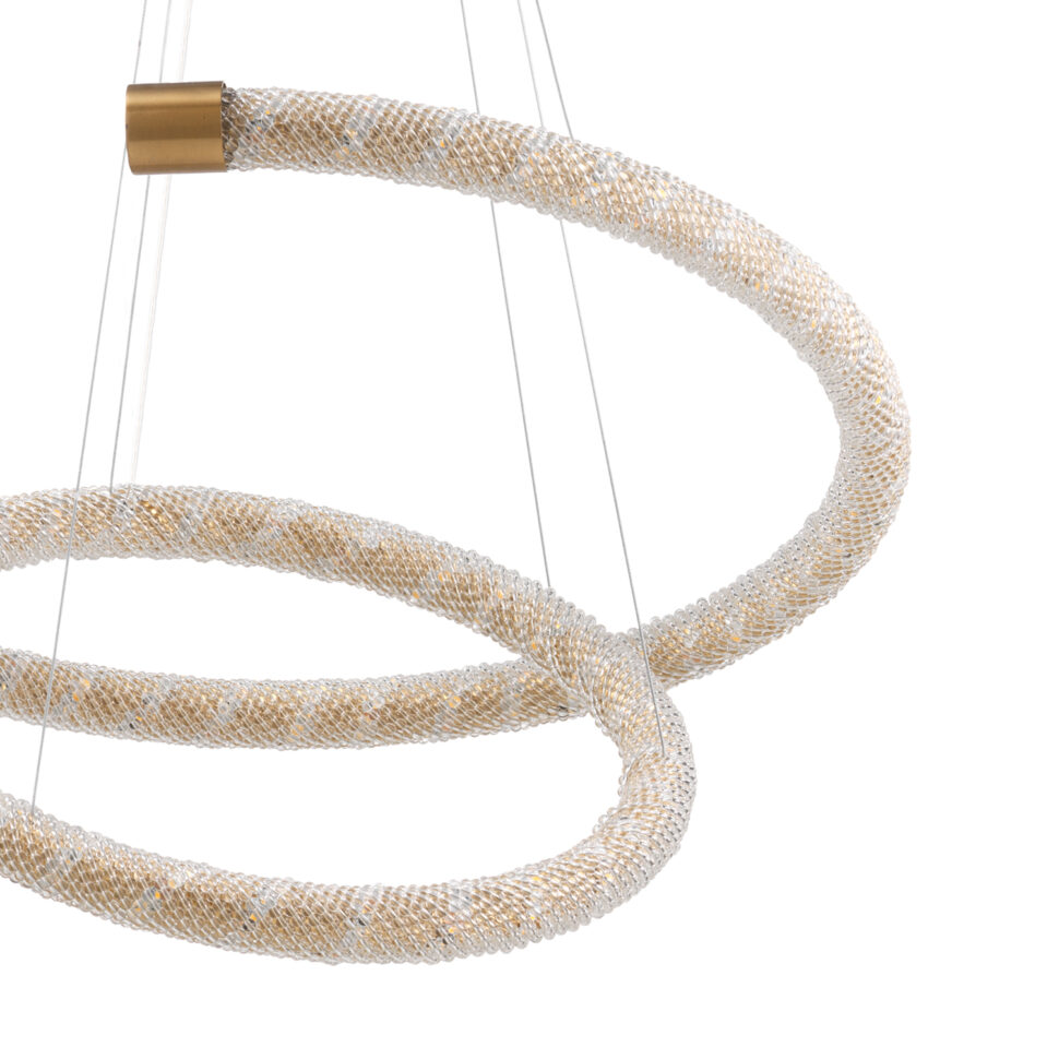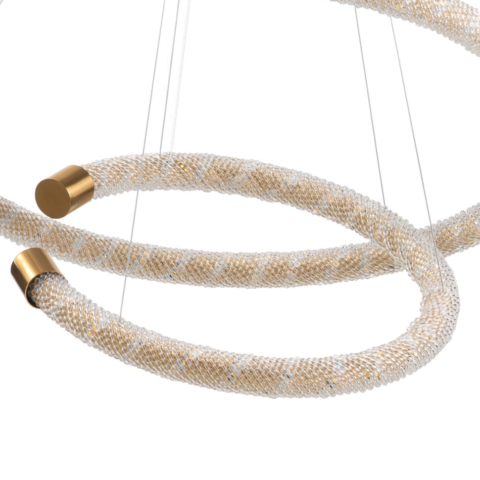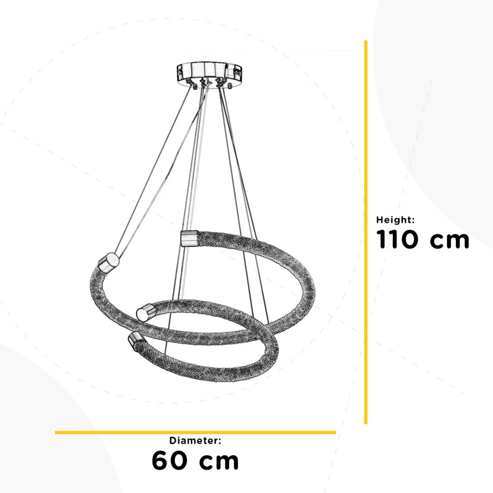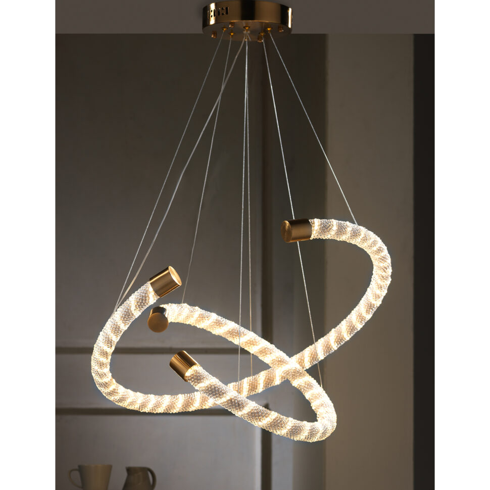 Il lampadario Clotilde è una raffinata lampada da soffitto che unisce design moderno ed eleganza senza tempo. Il rosone in metallo dorato, abbinato al cablaggio trasparente, sostiene due elementi circolari intrecciati, realizzati con una finitura luminosa che diffonde la luce in modo uniforme e scenografico. Grazie alla sua forma sinuosa e contemporanea, Clotilde diventa protagonista dello spazio, donando un tocco di esclusività e stile. La sua luce avvolgente lo rende perfetto per ambienti conviviali e raffinati come il salotto e la sala da pranzo, ma anche per aggiungere eleganza e modernità alla camera da letto. Un lampadario pensato per chi cerca un’illuminazione non solo funzionale ma anche decorativa, capace di valorizzare l’arredamento e creare atmosfere sofisticate. Il dispositivo, per interni, è ideale per essere installato a soffitto.
