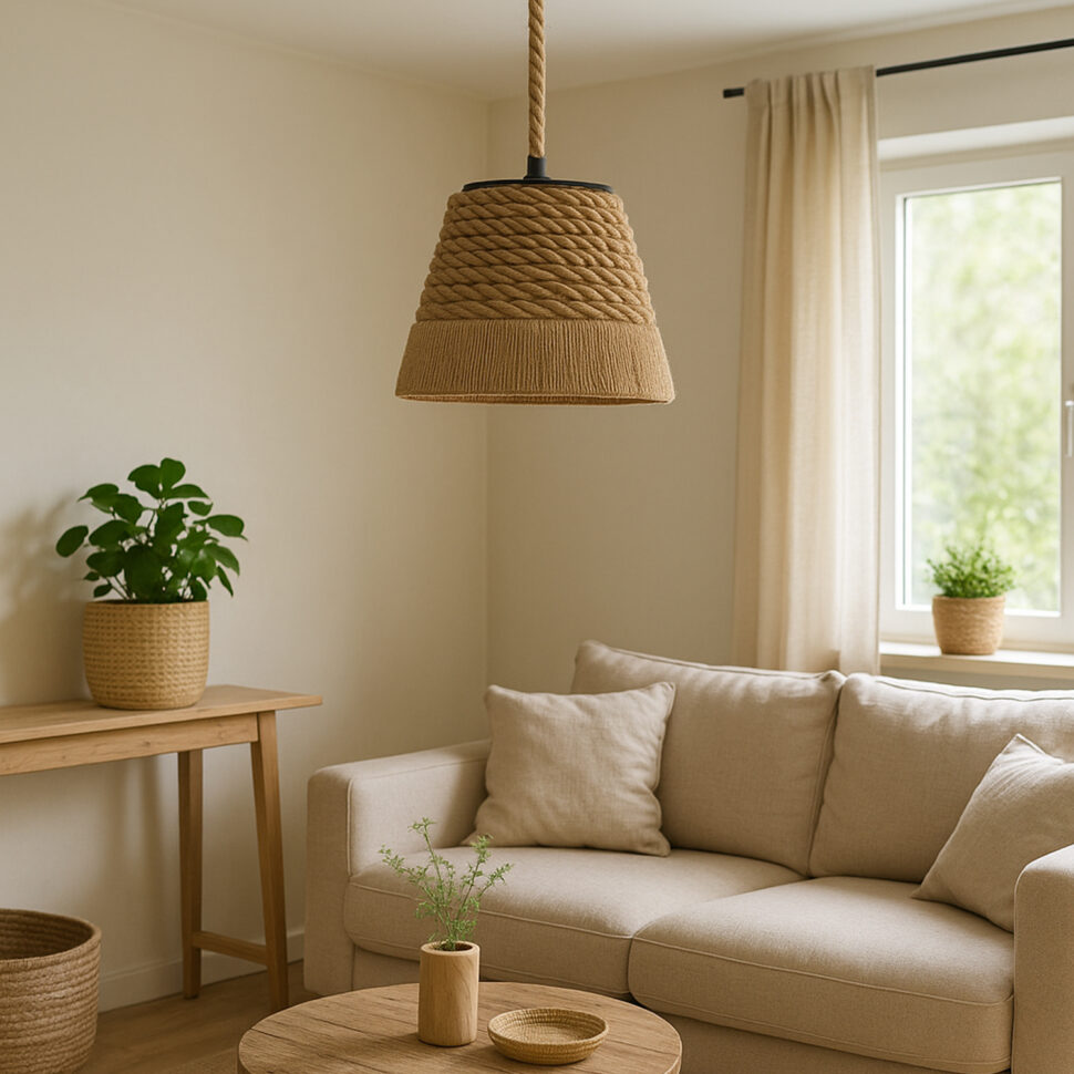Lampada da soffitto ad una luce con particolari in corda. Ideale per il soggiorno o anche in cucina. Per chi vuole vivere in un ambiente Nature senza rinunciare allo stile!