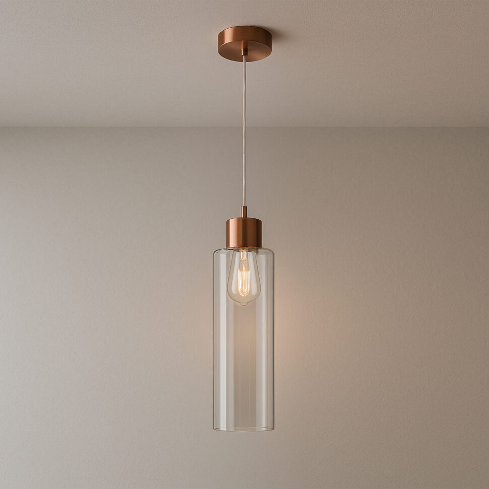 La sospensione Dodo nella versione rame unisce modernità e calore. Il paralume cilindrico in vetro trasparente lascia la lampadina a vista, rendendola protagonista e creando un effetto luminoso avvolgente. L’attacco e il rosone in finitura ramata donano eleganza contemporanea e un tocco sofisticato, perfetto per cucine, sale da pranzo o living dal carattere accogliente e ricercato.