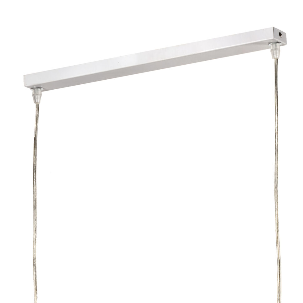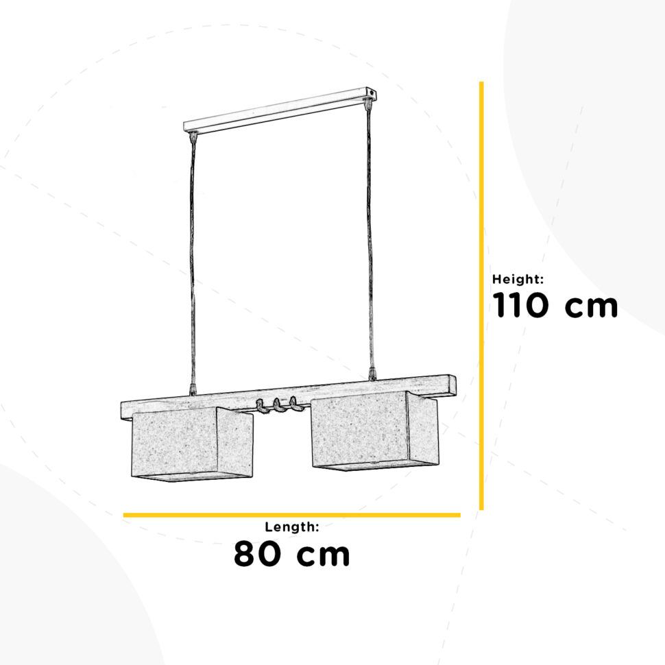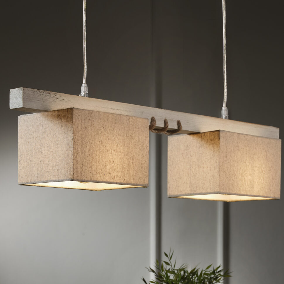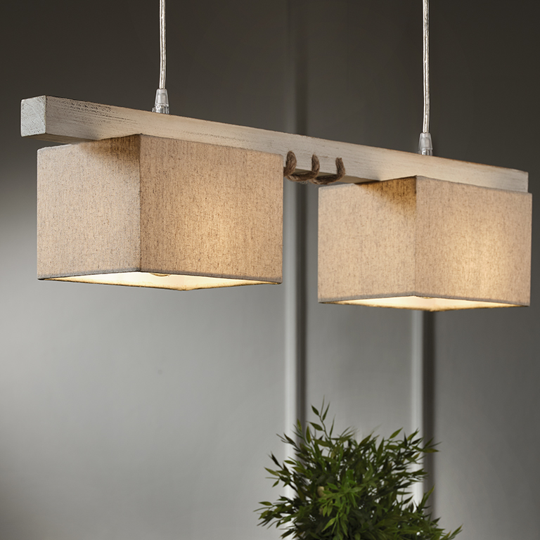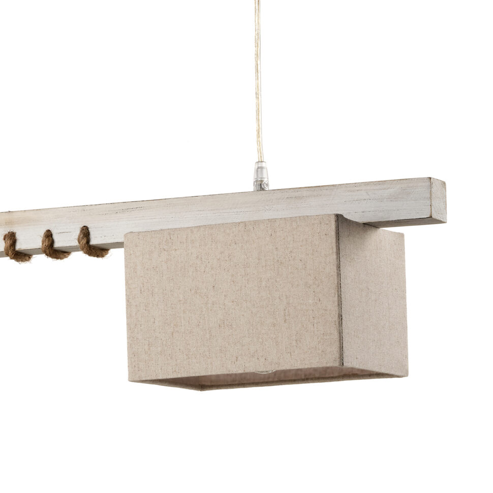 Sospensione in legno naturale con dettagli in corda e doppi paralumi in tessuto beige. Struttura realizzata in vero legno con finitura chiara effetto decapato, impreziosita da elementi in corda che donano un carattere artigianale e autentico. I paralumi in stoffa dalla forma cubica diffondono una luce calda e morbida, ideale per creare un’atmosfera accogliente in cucina, soggiorno o sala da pranzo. Il corpo lampada è sostenuto da due cavi trasparenti collegati a una barra rettangolare bianca da soffitto, con altezza regolabile per adattarsi a diverse esigenze di spazio. Una sospensione dal design naturale e raffinato, perfetta per ambienti in stile rustico, scandinavo o shabby chic.