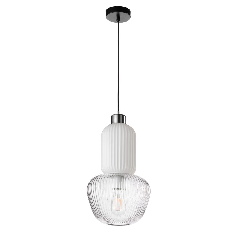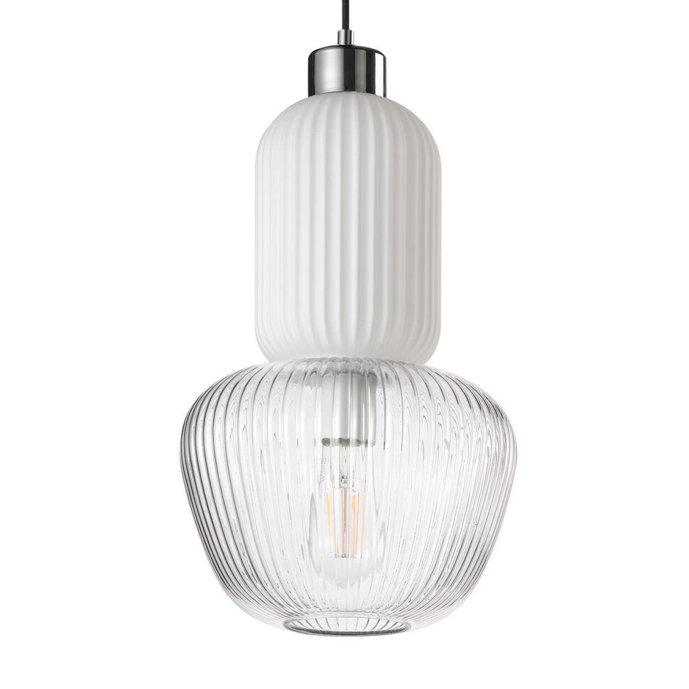 La sospensione Jelly si distingue per il suo design originale e sofisticato, realizzato con un doppio vetro che ne definisce l’estetica. La parte superiore è in vetro bianco opalino, con una superficie finemente rigata che contribuisce a diffondere una luce morbida e uniforme. La parte inferiore, invece, è in vetro trasparente, anch’esso lavorato con eleganti scanalature verticali che amplificano i giochi di luce e valorizzano la sorgente luminosa interna. L’accostamento tra i due vetri – il bianco che regala un’illuminazione calda e accogliente e il trasparente che dona brillantezza e leggerezza – rende questa sospensione perfetta per chi cerca un complemento d’arredo moderno, raffinato e allo stesso tempo funzionale. Ideale sopra un tavolo da pranzo, in un soggiorno o anche in ambienti contract, Jelly porta con sé un tocco di design contemporaneo che non passa inosservato.
