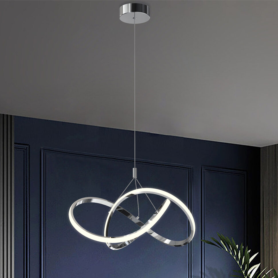 La sospensione LOOP è un elemento di illuminazione moderno e di grande impatto scenico. Realizzata con una struttura in metallo cromato lucido, si distingue per l’elegante gioco di forme intrecciate che richiamano un anello in movimento continuo. L’anello LED integrato, con diffusore bianco opalino, garantisce una luce omogenea e confortevole, ideale per illuminare con stile soggiorni, sale da pranzo o ambienti contemporanei. La finitura cromata dona luminosità e riflessi preziosi, esaltando il design minimalista e sofisticato. Sospesa tramite cavi sottili regolabili in altezza, la LOOP permette di personalizzare la disposizione secondo le esigenze dell’ambiente. È la scelta perfetta per chi cerca un lampadario sospeso dallo stile moderno, capace di unire funzionalità e design scultoreo.