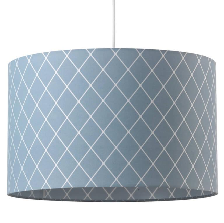 Sospensione a una luce con paralume cilindrico in tessuto celeste e righe bianche che creano dei rombi. Ideale per camere da letto.