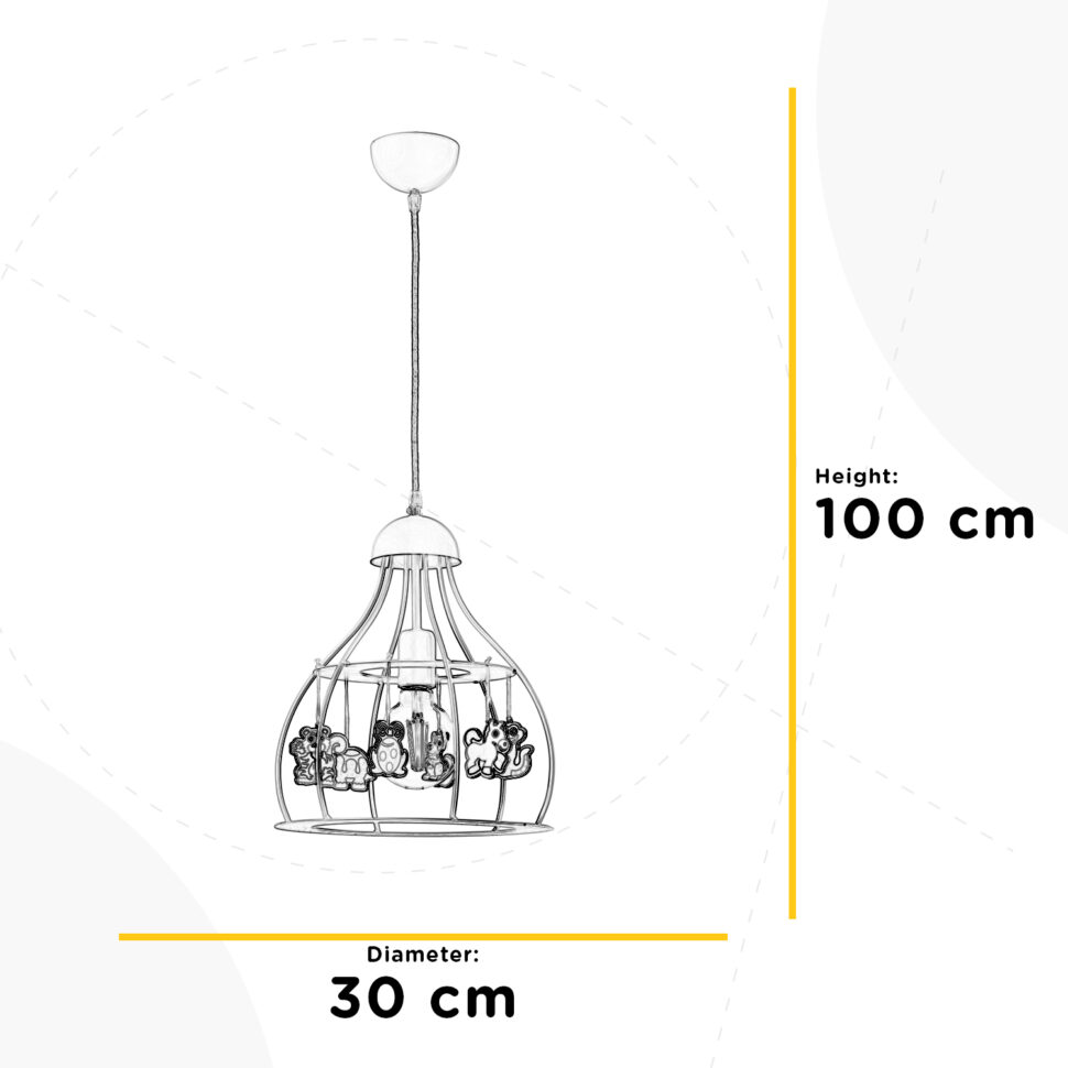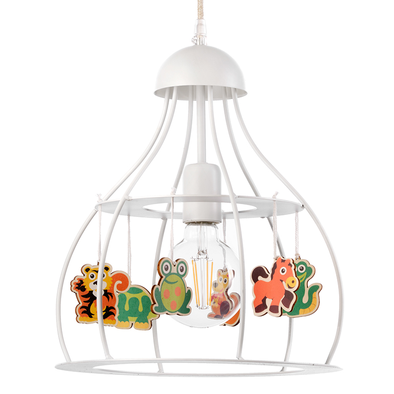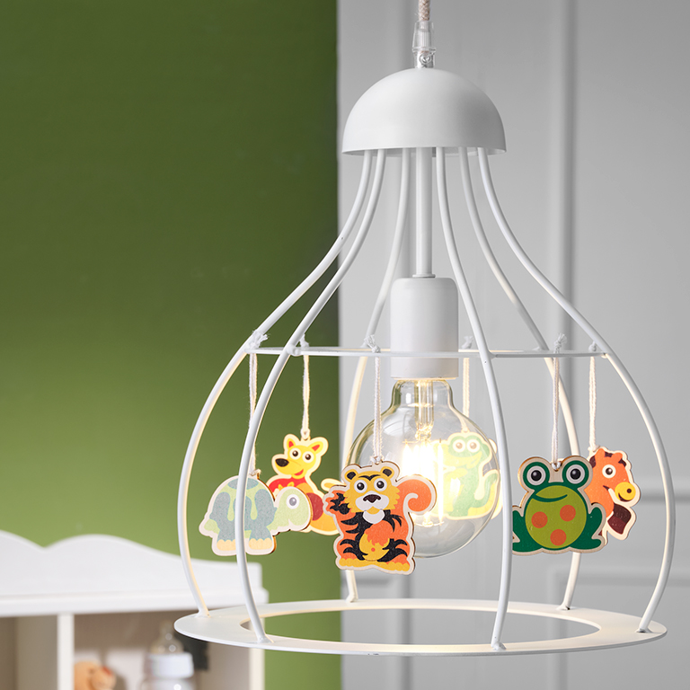 Realizzata in metallo bianco, la sospensione della collezione Noè somiglia ad una gabbietta. Al suo interno nessun animaletto è tenuto prigioniero, al contrario, è libero di muoversi ad ogni alito di vento. Sì perché la caratteristica principale che distingue questa lampada da soffitto sono i pendagli in legno, tutti colorati e raffiguranti animali diversi, tra cui una rana, una tartaruga, un cavallo ed altri che facciamo scoprire a te...e ai tuoi bambini!