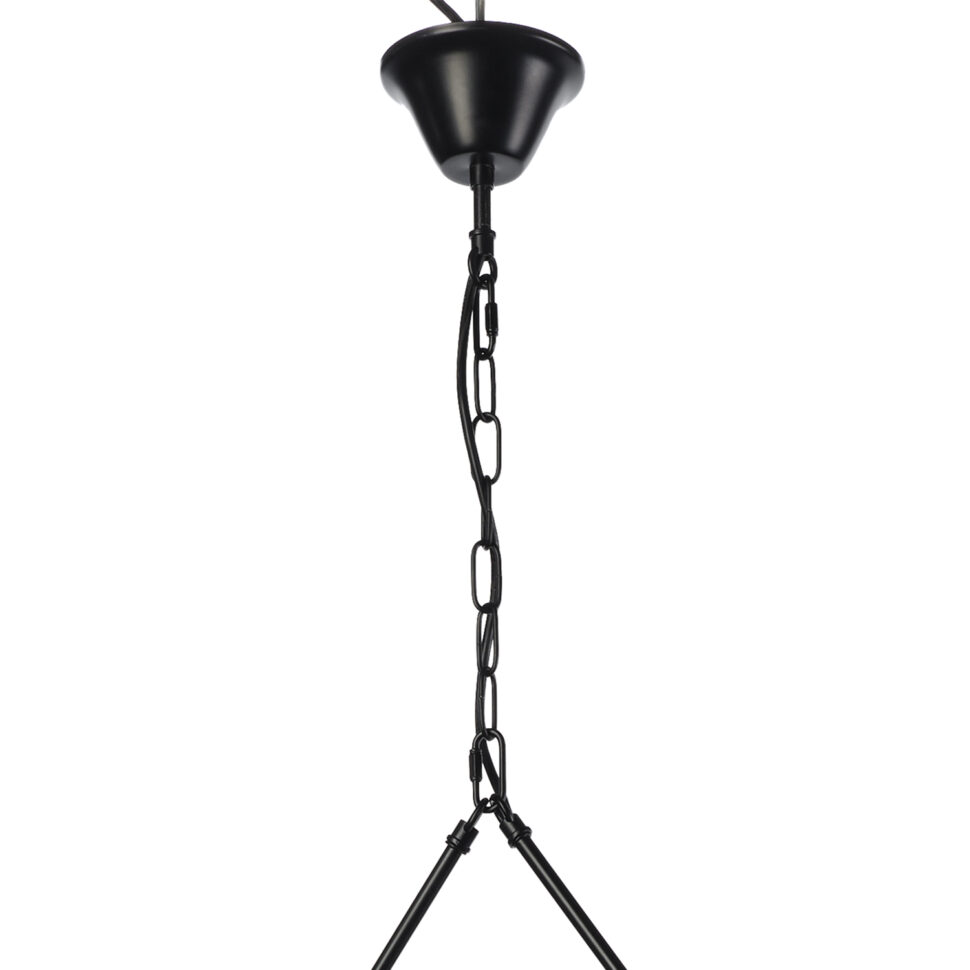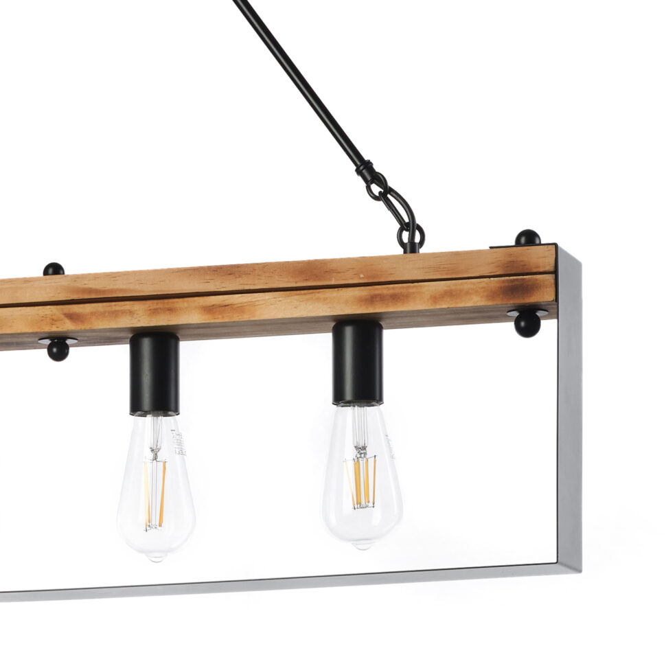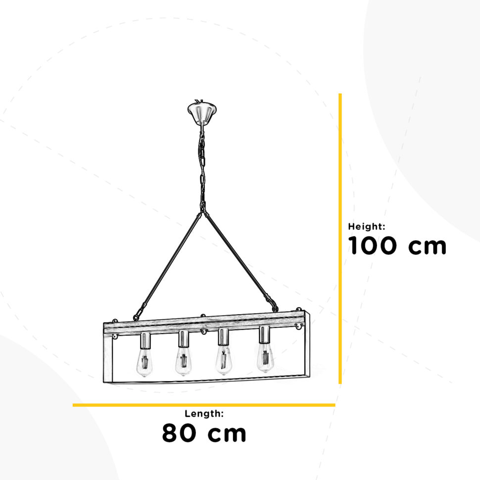 Lampadario da soffitto a 4 luci. La struttura è formata da un lato superiore in legno e i restanti 3 lati da una lamina di metallo color nero. La stuttura è retta da due sbarre in metallo nero che formano un triangolo, a seguire abbiamo una catena color nera con il rosone abbinato. Ideale nella zona giorno sopra il tavolo o in salotto. Ricordiamo che le lampadine non sono incluse.