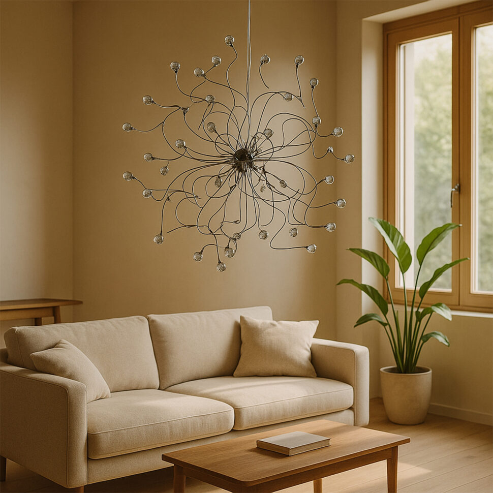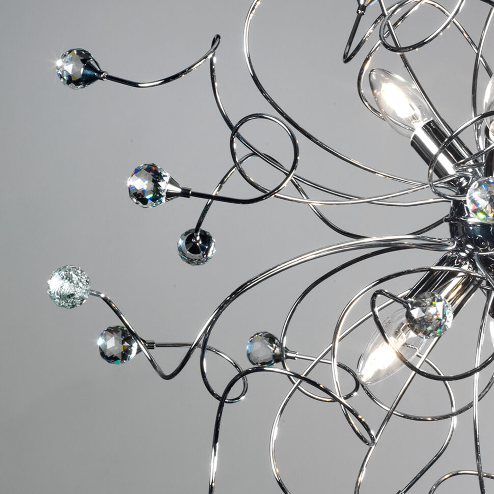 La sospensione TRILLY a sei luci colpisce per il suo design dinamico e ricercato. I bracci sottili e intrecciati in metallo cromato si aprono a raggiera, terminando con sfere in cristallo K9 che brillano come piccole gemme. Le sei sorgenti luminose garantiscono un’ottima illuminazione, diffondendo una luce scintillante che valorizza ogni ambiente. Perfetta come lampadario da soggiorno o sala da pranzo, unisce modernità e fascino senza tempo.