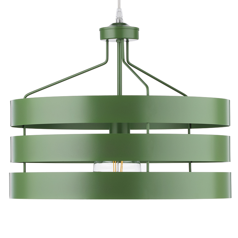 La sospensione Ulisse è una moderna lampada da soffitto in metallo verde. Il suo design è semplice ed originale al tempo stesso, in quanto si compone essenzialmente di tre fasce metalliche che avvolgono circolarmente l'attacco per la luce, che è di tipo E27.
